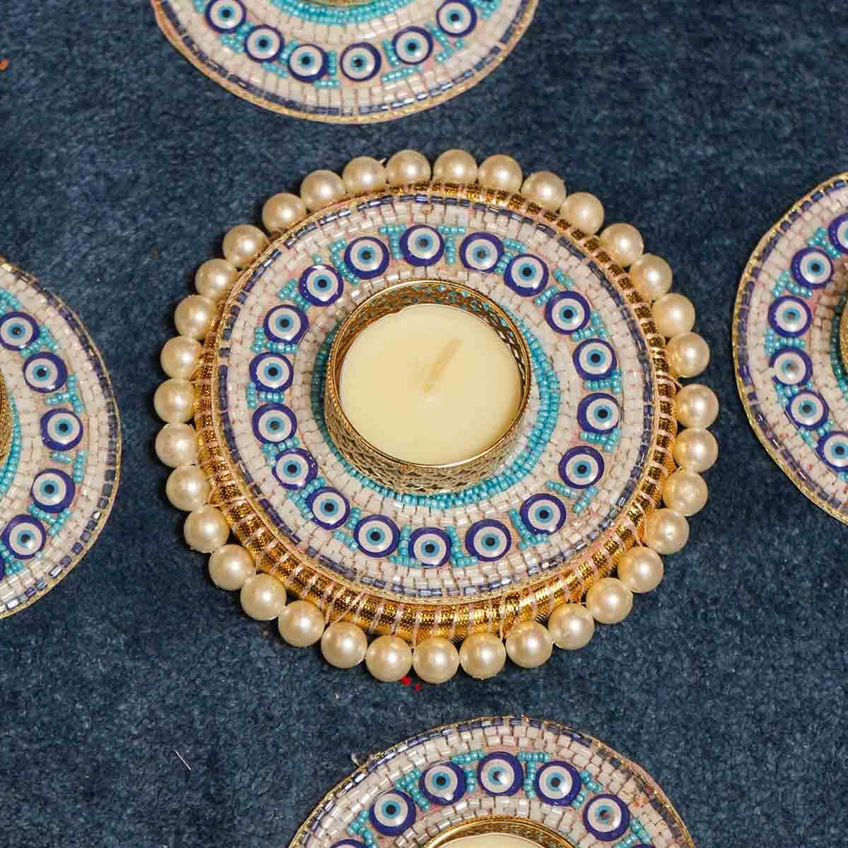Enhance your festive celebrations with this sophisticated set of five beaded decorative diyas arranged in a rangoli design. Each diya features intricate beadwork that adds texture and a refined sparkle, creating an inviting and elegant ambiance for your home. Ideal for elevating traditional décor with a contemporary touch.