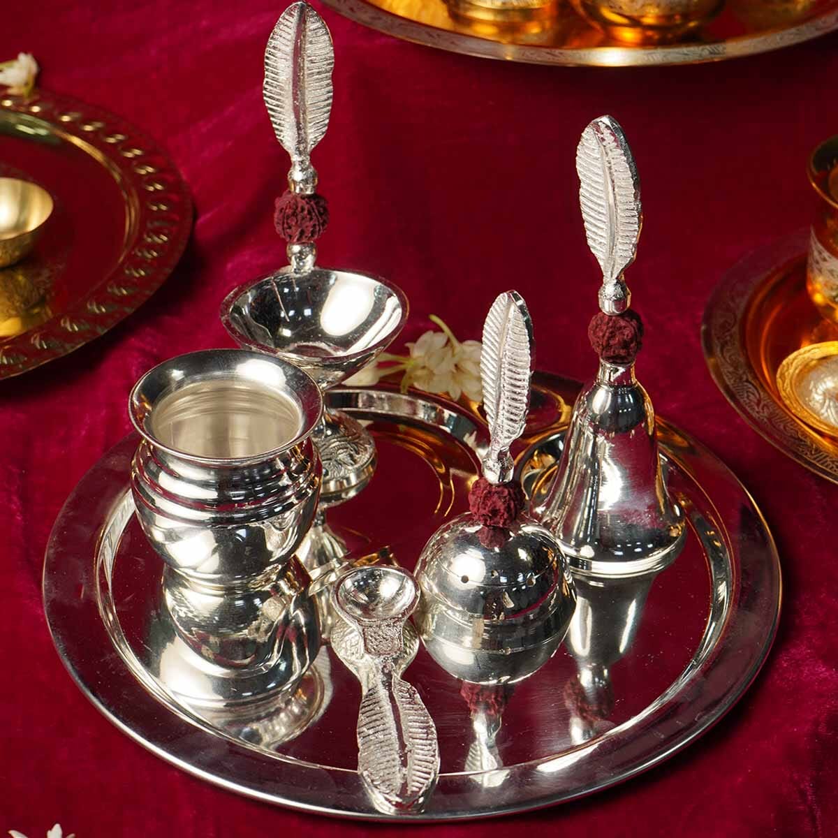 Elevate your sacred rituals with this Elegant Silver Plated Pooja Thali Set. Meticulously crafted with premium silver plating, this set combines traditional design with superior craftsmanship. The durable construction ensures longevity while maintaining its lustrous finish through countless ceremonies. Perfect for daily worship, special occasions, and festivals, this thali set serves as both a functional ritual implement and an heirloom-quality addition to your spiritual collection.