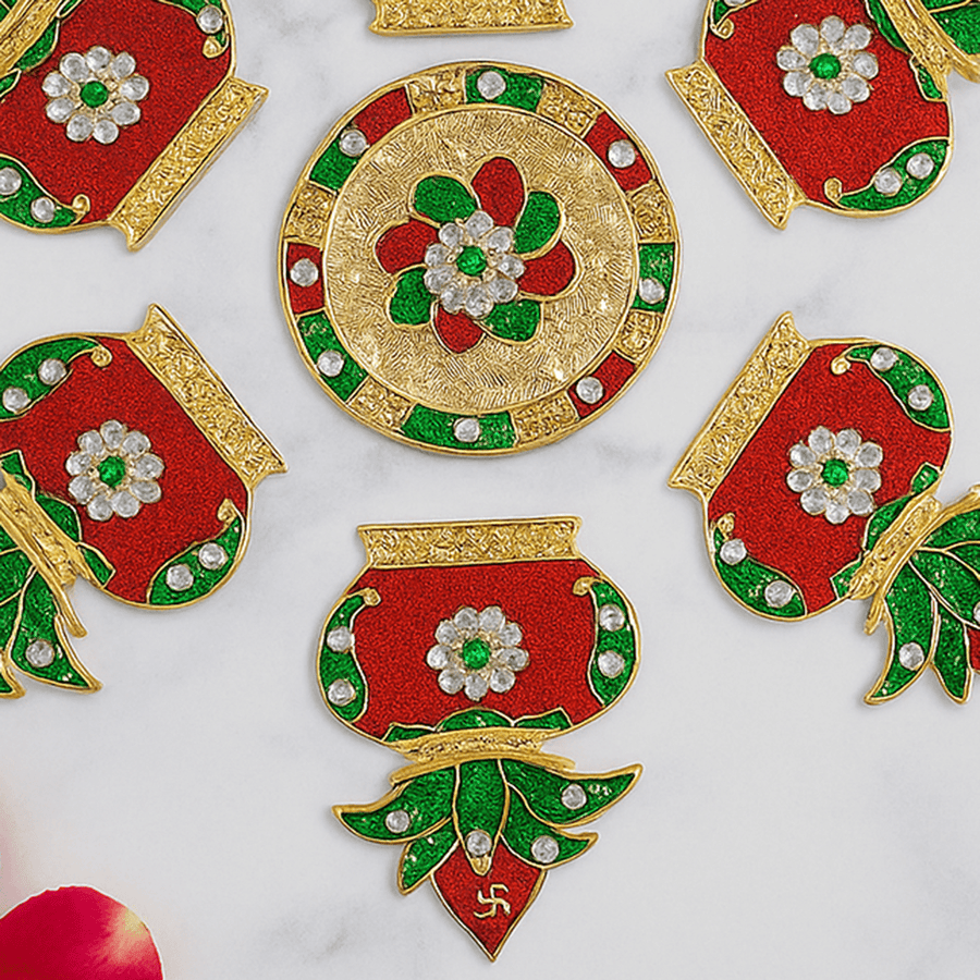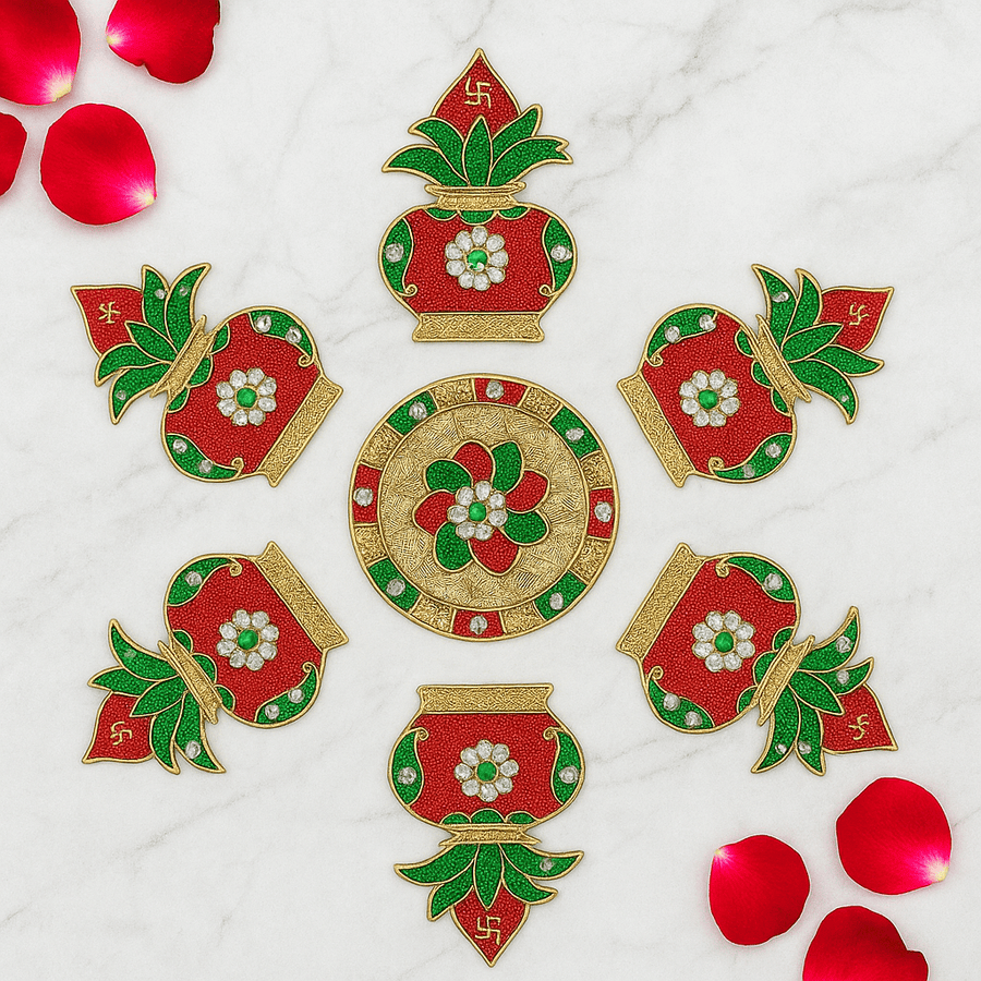 The Festive Kalash Acrylic Rangoli Set combines a round centerpiece with six kalash-shaped side pieces to create an exquisite rangoli design. Featuring rich red, gold, and green hues, this set adds a refined and vibrant touch to your festive décor. Its elegant craftsmanship enhances traditional celebrations with a modern aesthetic, making it a tasteful centerpiece for any occasion.