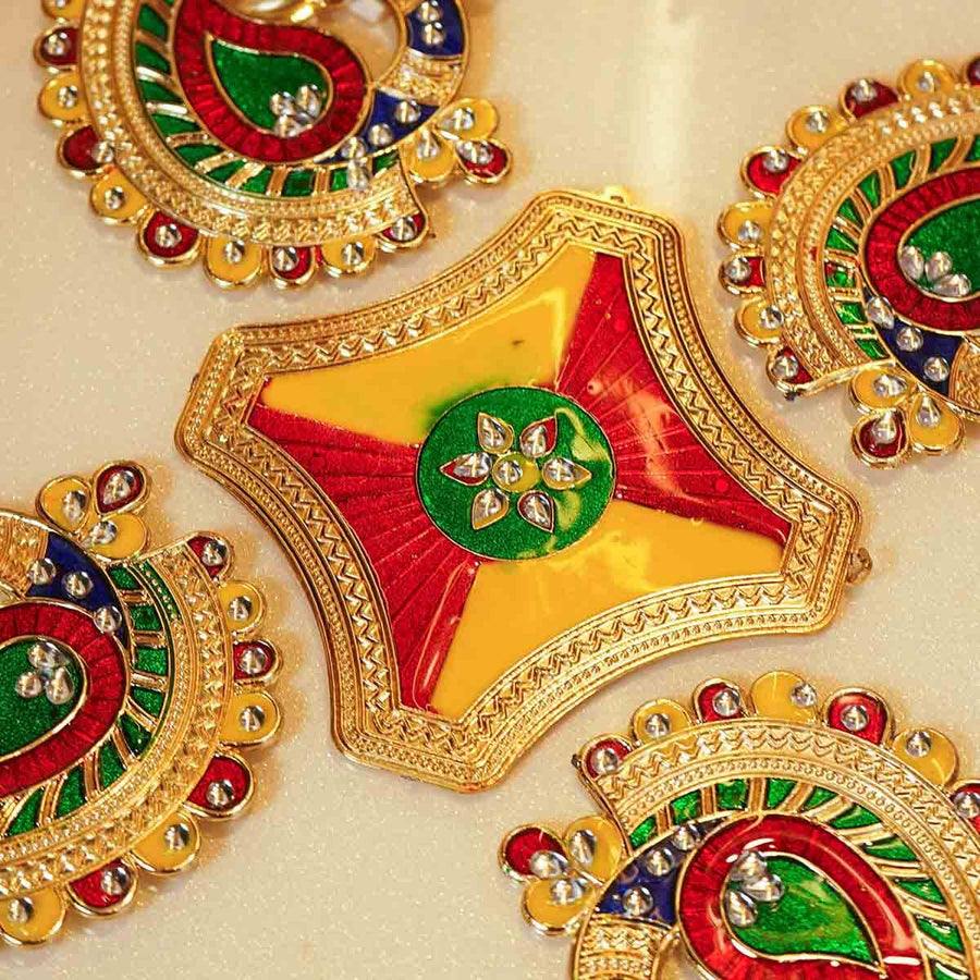 The Festive Peacock Acrylic Rangoli Set features a striking centerpiece accompanied by four large peacock-shaped side pieces. When arranged together, they form an elegant rangoli that captures the beauty and grace of the peacock motif. Crafted with a refined design sensibility, this set enhances your festive décor with a sophisticated blend of tradition and artistry.