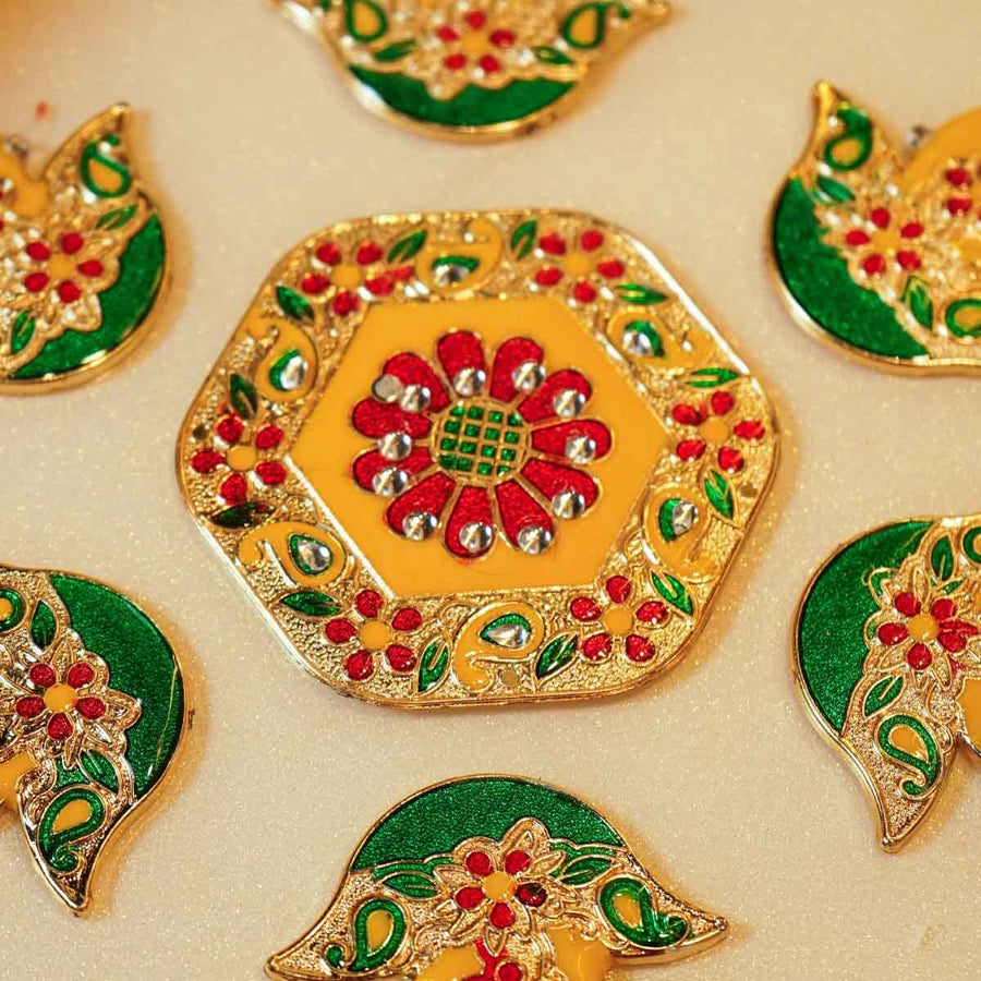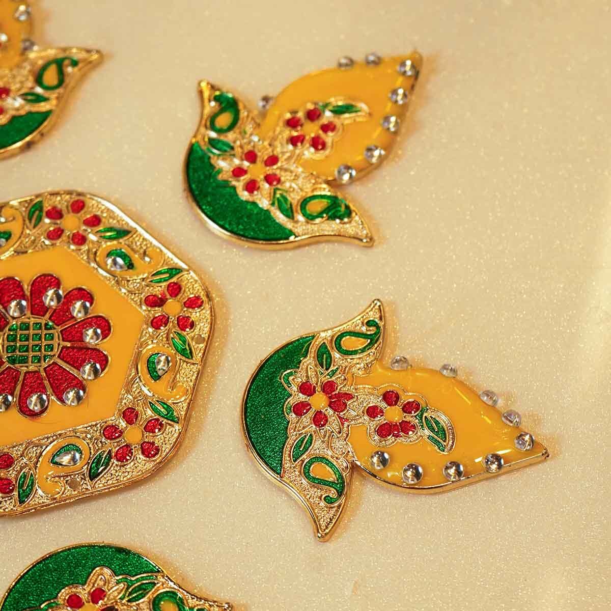 The Festive Yellow Acrylic Rangoli Set includes a radiant centerpiece alongside six diya-shaped side pieces. Together, they create a harmonious rangoli design that celebrates light and warmth. With its elegant yellow tones and refined shapes, this set brings a sophisticated charm to your festive arrangements, perfect for enhancing traditional celebrations with subtle grace.