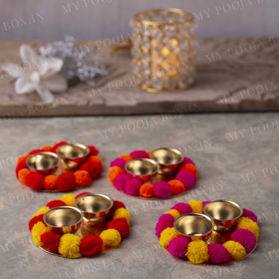Keep your Akshat and Roli safely yet neatly in this Akshat Roli platter from My Pooja Box! The metal base of this Pom Pom Akshat Roli Platter is decorated with orange and yellow pompoms that add to its beauty. The two tiny bowls make it easy to keep Roli and Akshat safely. Get it today to make your upcoming pooja or celebration memorable. Colour may vary as per the availability.