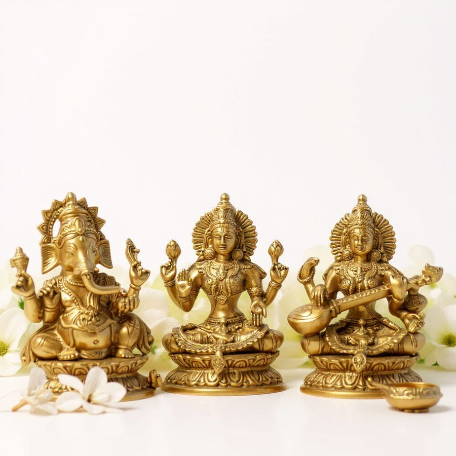 Bless your puja place and heighten the beauty of spirituality with this artefact that comes with three idols of Ganesha, Saraswati and Laxmi. All the three idols of Ganesha, Saraswati and Laxmi are seen with four hands sitting on three separate bases. The idol of Lord Ganesha is holding ,Laddu‚, ,Lotus‚ and , Hatchet‚ in three hands while the fourth hand is in a blessing posture. The Idol of goddess Laxmi is seen holding two ,Lotus‚ flowers in her two hands while the third hand is seen dropping gold coins and the fourth hand is in a blessing posture. Holding ,Pustaka‚, ,Mala‚, , Water Pot‚ and ,Veena‚ in her four hands, Saraswati is known as the goddess of music, knowledge and speech.