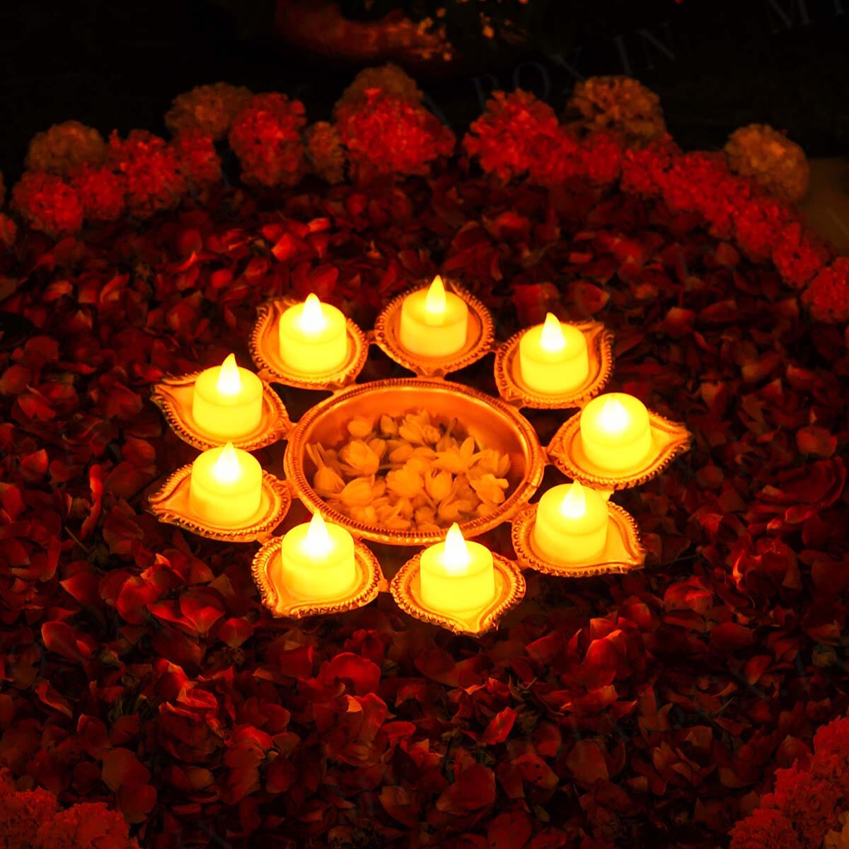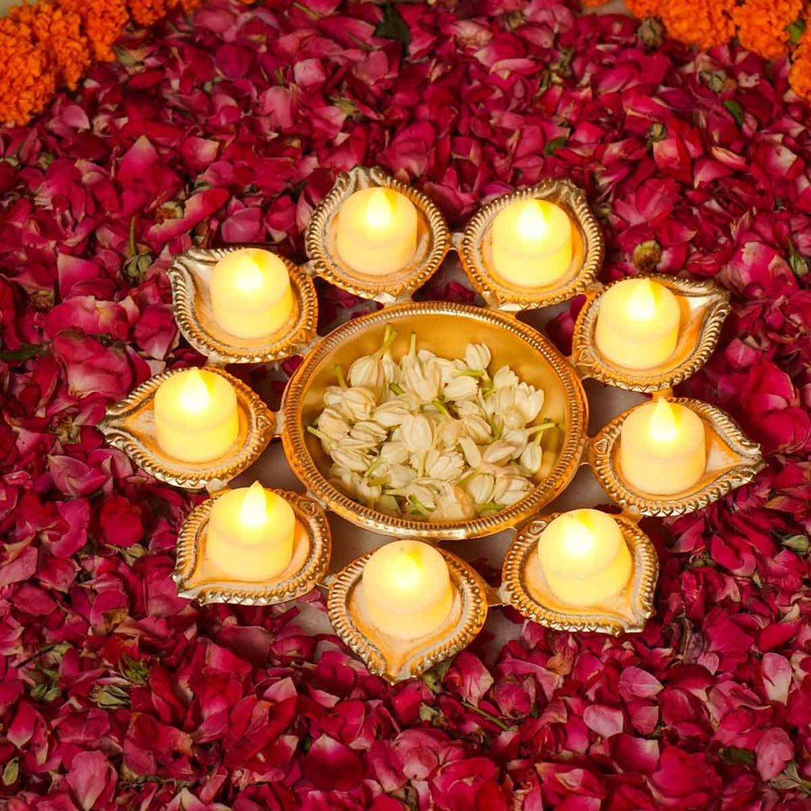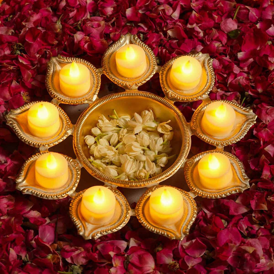 The White Gold Small Urli with Swastik Design combines traditional symbolism with elegant craftsmanship. Its compact size makes it ideal for sacred rituals and decorative displays. Crafted with a white gold finish, it offers durability and a refined appearance. The swastik motif, a symbol of auspiciousness and prosperity, enhances the spiritual significance of this urli, making it a meaningful addition to any pooja or festive setting.